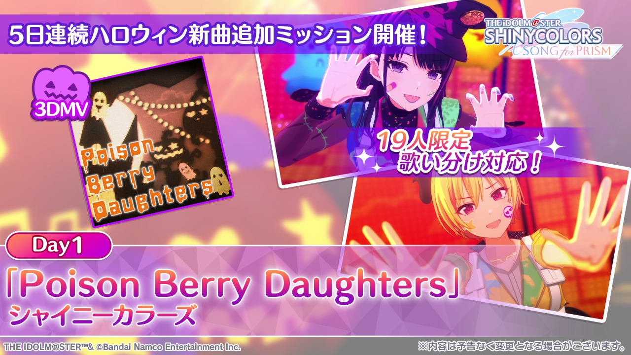 「アイドルマスター シャイニーカラーズ Song for Prism」で、ハロウィン新曲シリーズの追加が決定した。5日連続新曲リリース1日目は、シャイニーカラーズ「Poison Berry Daughters」を追加予定。