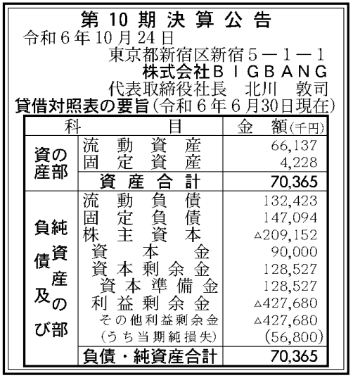 BIGBANGの2024年6月期(第10期)の決算は、最終損失が5600万円と赤字幅が縮小した。前の期(2023年6月期)の実績は、最終損失9800万円だった。10月24日付の『官報』に掲載された「決算公告」で判明した。