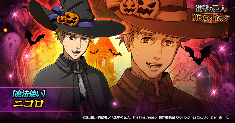 enish<3667>は、『進撃の巨人Brave Order』において、10月25日(金)より、暴食の魔法使いを開催。また、本日より新登場の【魔法使い】サシャ・ブラウス、【魔法使い】ニコロがピックアップされた「暴食の魔法使いガチャ」も開催する。