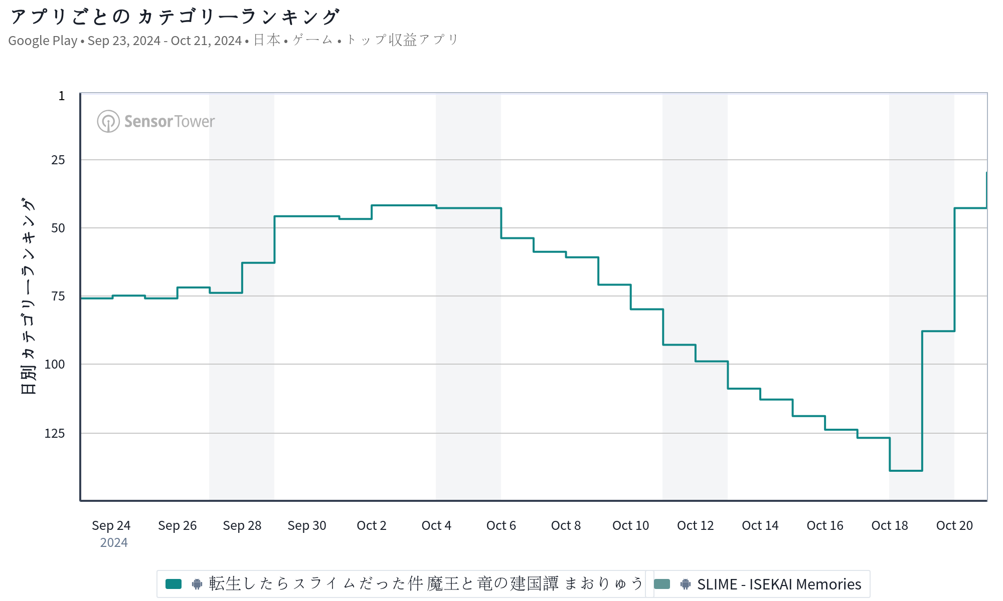 また、バンダイナムコエンターテインメントの『転生したらスライムだった件 魔王と竜の建国譚』が前日の43位から30位に上昇し、トップ30圏内に復帰した。『まおりゅう』は、10月28日に3周年を迎えることを記念した前夜祭キャンペーンを実施しており、その中で「3rd Anniversary 超魔王竜祭 スカウト」を開催していることなどが今回の順位上昇につながっているもようだ