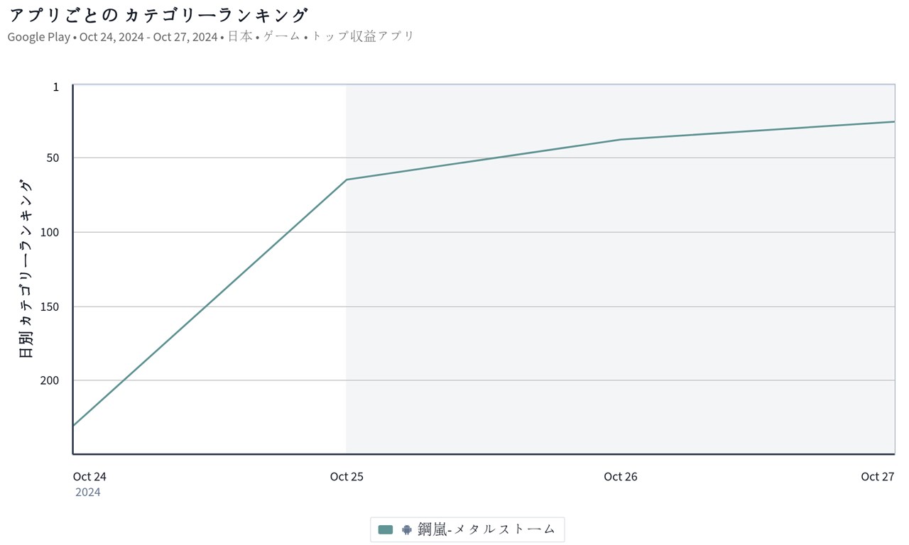 また、HK TEN TREEが10月23日にリリースしたばかりの新作『鋼嵐 - メタルストーム』が26位とトップ30圏内に飛び込んできた。本作は、ロボットバトルと戦略ストラテジーが合わさった王道SRPG。ゲーム内ではリリースと同時にSクラス操縦士「ローズ」のスカウト確率アップした操縦士PUスカウト「決意のヴァルキリー」や、SクラスST「XR」カタログピックアップの「力こそ正義」を開始しており、セールス面でも順調なスタートを切る形になっているもよう。