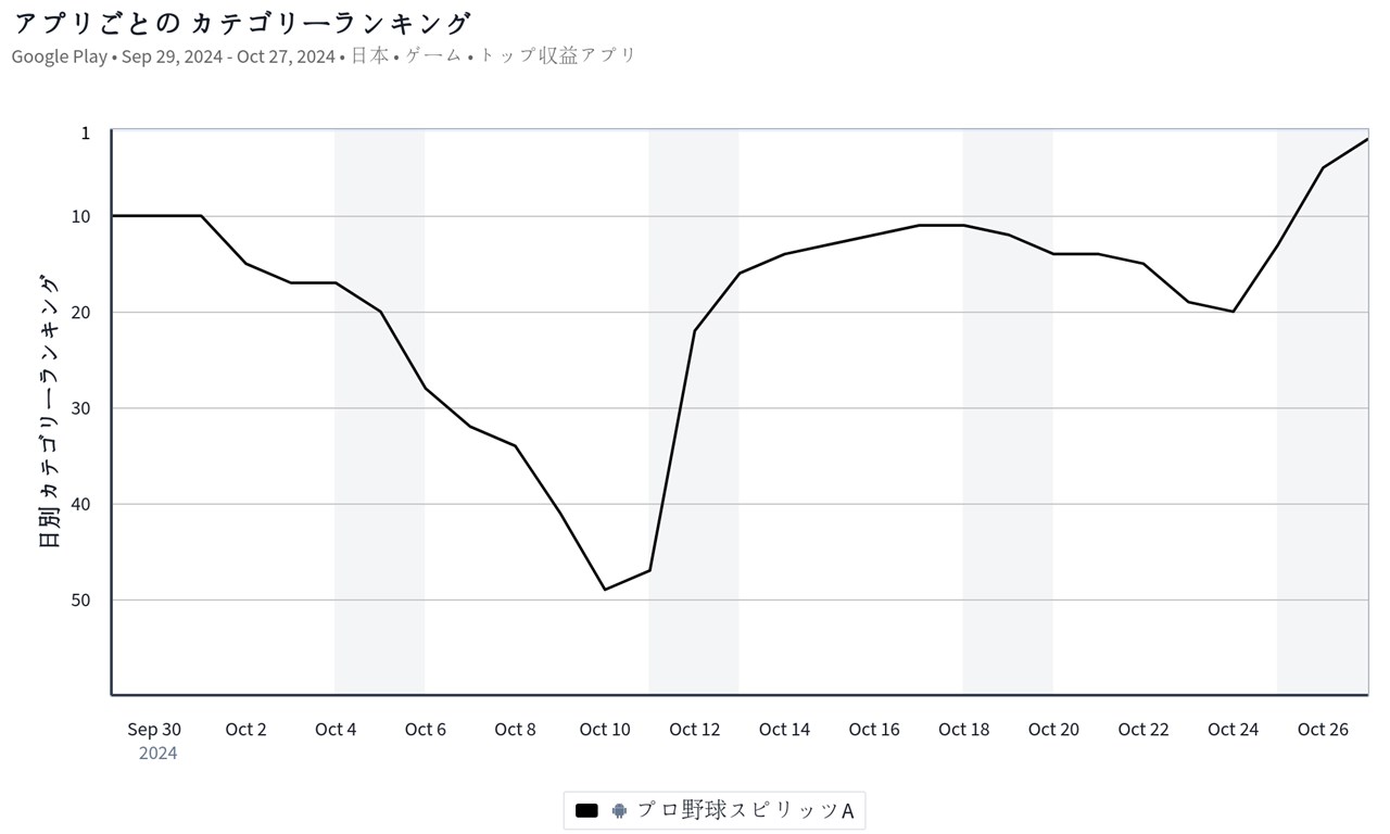 続く2位には、コナミデジタルエンタテインメントの『プロ野球スピリッツA』が急上昇してきた。『プロスピA』は、10月24日より、右翼手の「大谷翔平」ら世界へ挑んだ名選手たち「2024 OB ワールドチャレンジャー」が登場したことが今回の売上上昇に大きく貢献しているようだ。