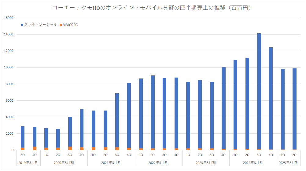 コーエーテクモホールディングス<3635>は、この日(10月28日)、2025年3月期 9月中間決算で、第2四半期(24年7~9月)における「オンライン・モバイル分野」の売上高について、前年同期比11.6%減の99億1000万円だったことを明らかにした。内訳は、MMORPGが同28.6%減の1億円、スマホ・ソーシャルが同11.4%減の98億1000万円だった。前年同期比では減収となったものの、前四半期との比較ではプラスとなった。