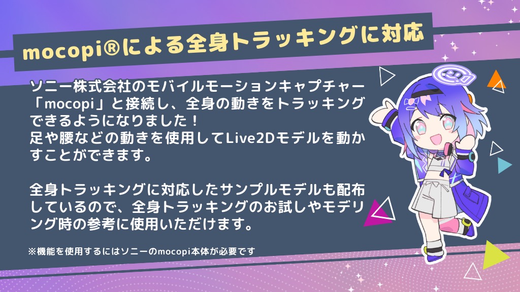 足や腰などの動きを使用してLive2Dモデルを動かすことができる。全身トラッキング及びハンドトラッキングに対応したサンプルモデル「柊アリサ」や、全身トラッキングに対応した新規サンプルモデルも配布しているので、全身トラッキングのお試しやモデリング時の参考に使用できる。