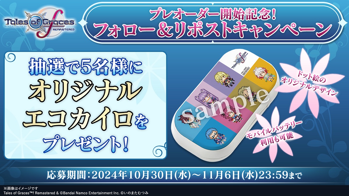期間中に該当の投稿をリポストすると、「テイルズ オブ グレイセス エフ リマスター」オリジナルエコカイロを抽選で5名にプレゼントする。