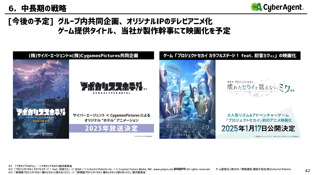 今後、育てたオリジナルIPについては、ゲーム化による収入や配信料、グッズ販売、興行などによる売上高構成比を高めることを目指しているそうだ。アニメ作品としては、サイバーエージェントとCygamesPicturesの共同企画「アポカリプスホテル」や「プロジェクトセカイ」の映画を主幹事として準備している。