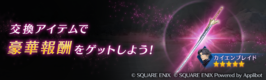 期間中、イベント限定の交換アイテム「派手な腰巻」や「白い羽根飾り」を集めることで、イベント交換所にて、アンジール専用武器「カイエンブレイド」や「★4以上武器確定ガチャチケット」、キャラ専用のウェポンパーツなど、さまざまなアイテムと交換することができる。