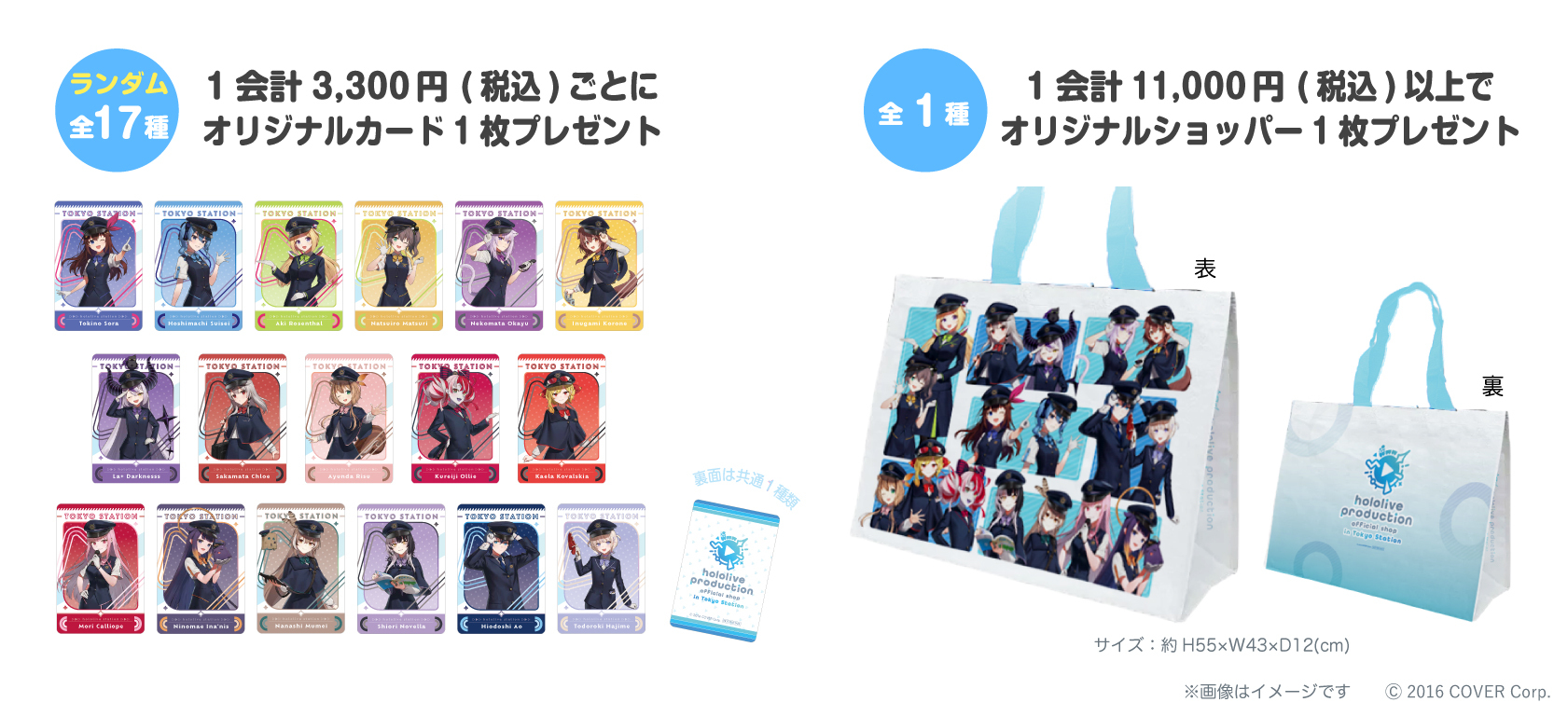 ・1会計の購入金額3300円(税込)ごとに1点「hololive Station オリジナルカード」(全17種/ランダム)
