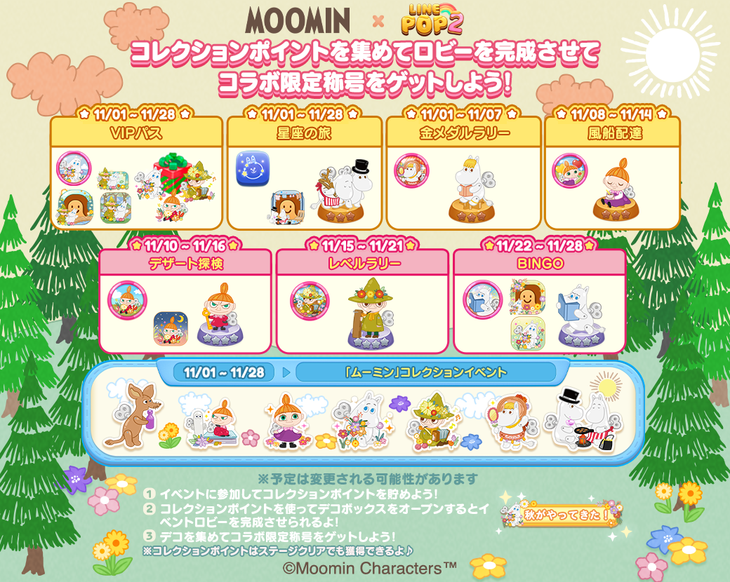 ビンゴイベントを開催する。通常ステージをクリアして、すべてのビンゴをそろえると「★4 秋のムーミン」やコラボ限定フレームやプロフィールが獲得できる。