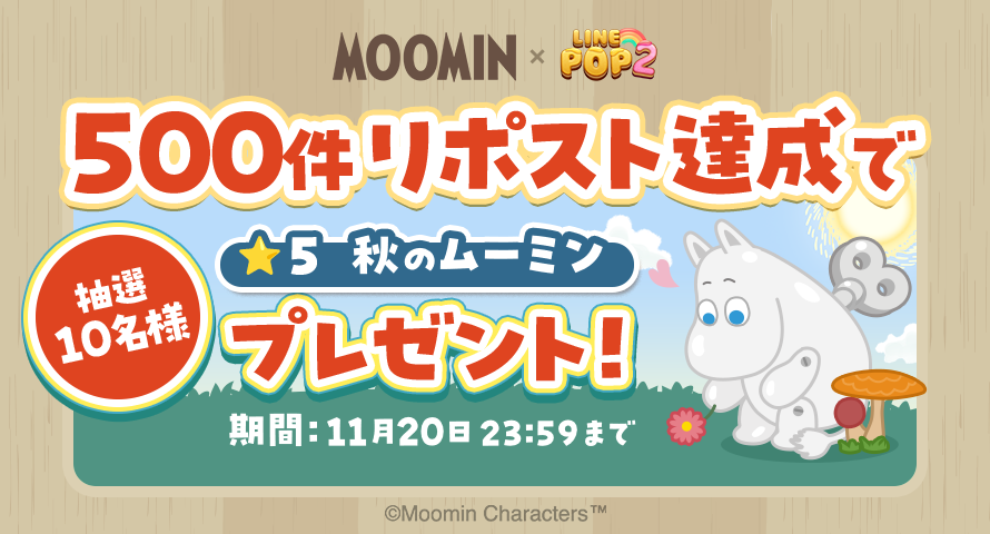 公式X(旧Twitter)フォロー&リポストキャンペーンを開催する。フォロー&リポストの合計数が500件を達成すると、「秋のムーミン(★5)」のミニモンが抽選で当たる。