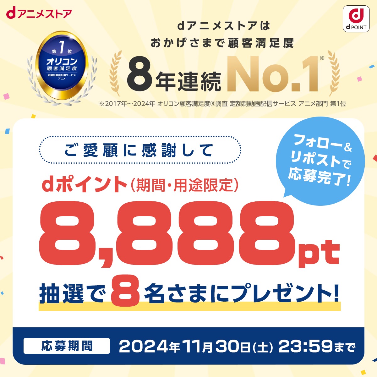 8年連続での1位獲得を記念して、2024年11月1日から11月30日まで公式X ※4でのキャンペーンを実施する。「dアニメストア」公式Xアカウントをフォローのうえ、対象のキャンペーンポストをリポストした人の中から抽選で8名さまにdポイント8,888pt(期間・用途限定)を進呈する。
