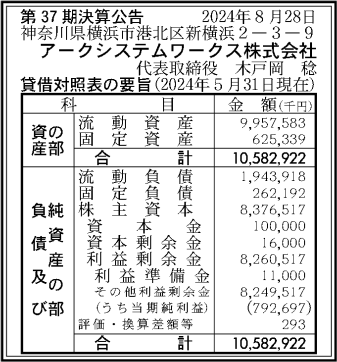 アークシステムワークスの2024年5月期(第37期)の決算は、最終利益が前の期比56.7%減の7億9200万円と減益だった。前の期(2023年5月期)の実績は、最終利益18億3200万円だった。9月17日付の『官報』に掲載された「決算公告」で判明した。