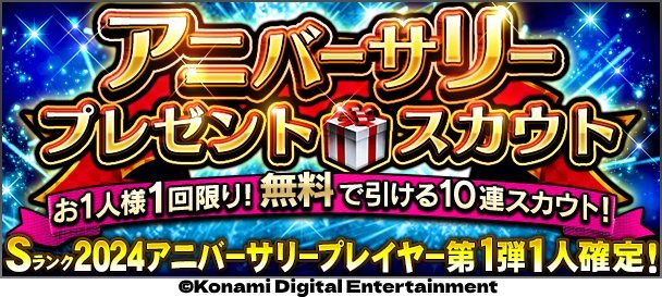 また、『プロスピA』9周年を記念して、Sランク「2024 アニバーサリープレイヤー第1弾」1人確定の無料10連スカウトを実施する。