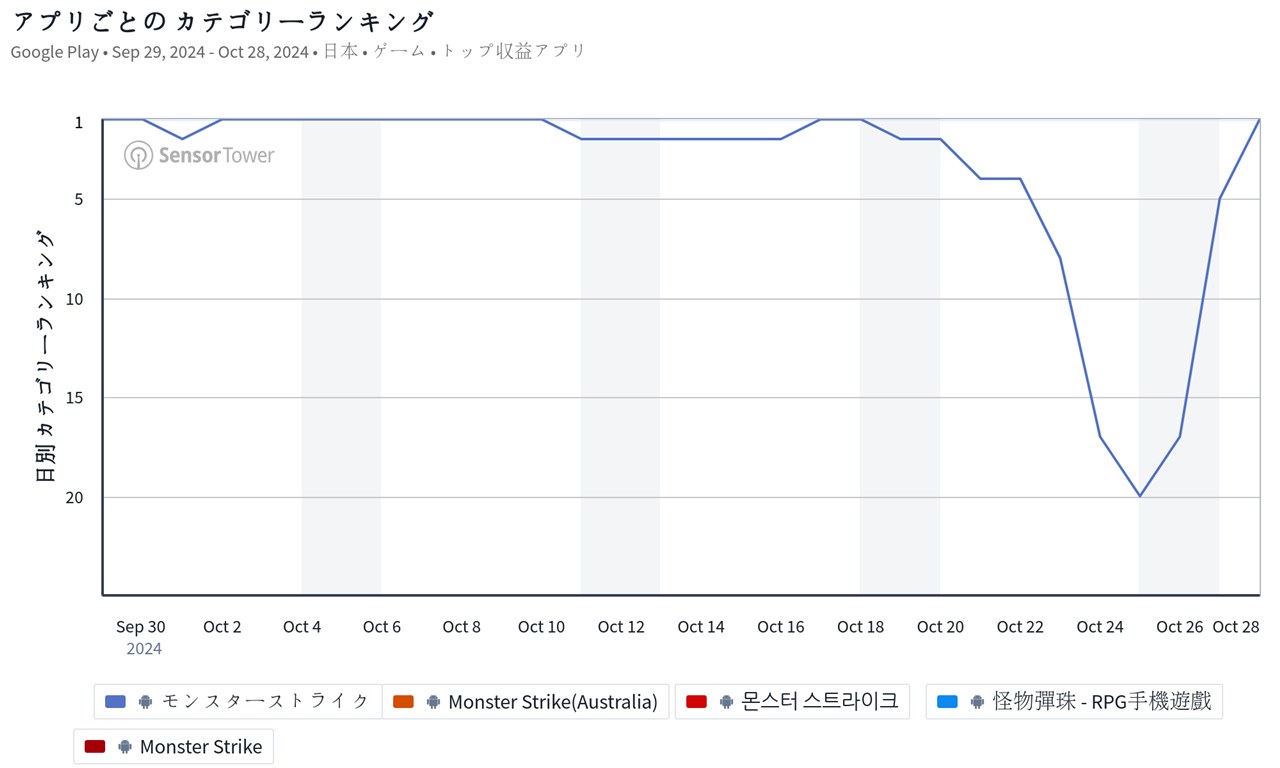 10月31日9時現在のGoogle Playのセールスランキングは、トップ30圏内に動きがなく、MIXI<2121>の『モンスターストライク』の首位が続いた。
