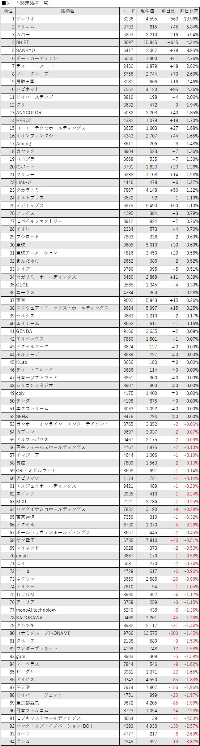こうしたなか、ゲーム・エンタメ関連企業をみると、登録されている94銘柄のうち、上昇は42銘柄(45%)、下落は42銘柄(45%)、変わらずは10銘柄(11%)で、上昇した銘柄数と下落した銘柄数は同じだった。