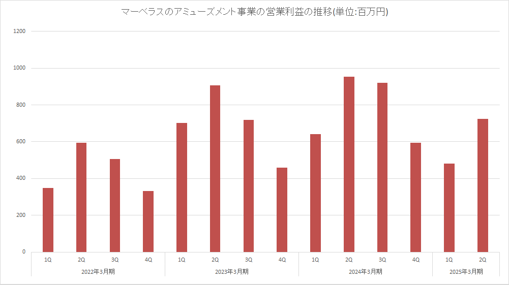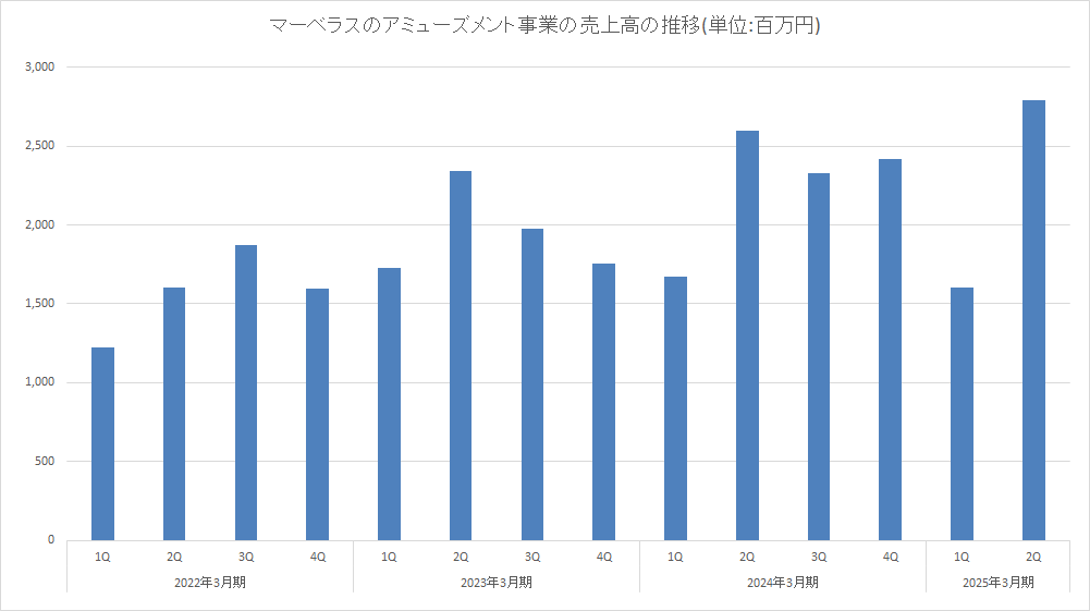 マーベラス<7844>のアミューズメント事業の9月中間決算は、売上高が前年同期比2.7%増の43億8800万円、セグメント利益が同24.3%減の12億600万円と増収減益だった。海外展開拡大で売上増となったものの、「ポケモン」アミューズメントゲームの新筐体への入れ替えに伴う費用先行などにより減益となった。第2四半期(24年7~9月)をみると、売上高はセグメント設置以来の最高水準になった。