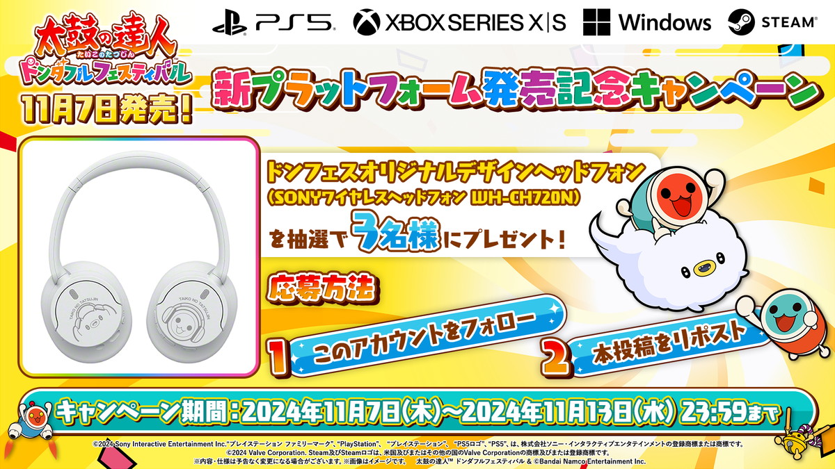 新プラットフォーム発売を記念して、フォロー&リポストキャンペーンを実施!計3名にどんちゃんとくもきゅんのオリジナルデザインが入ったヘッドフォンをプレゼントする。