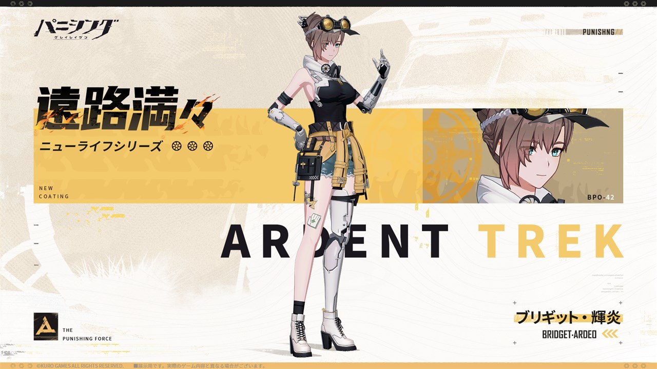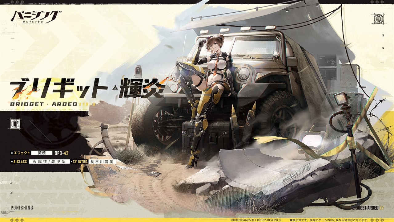 機体番号BPO-42、機体名「輝炎」。支援部隊の隊長。経験と実力から見ても、ブリギットは執行部隊の精鋭小隊に所属する資格がある。しかし適材適所という言葉があるように、彼女は支援部隊で皆をサポートする方が自身の価値をより発揮できると感じている。