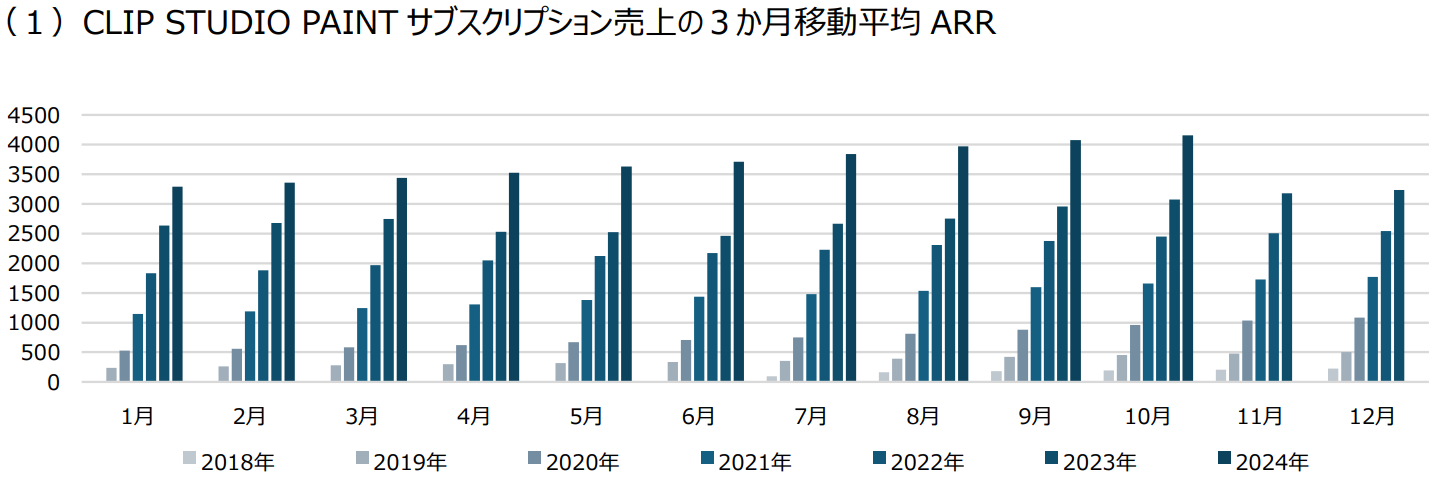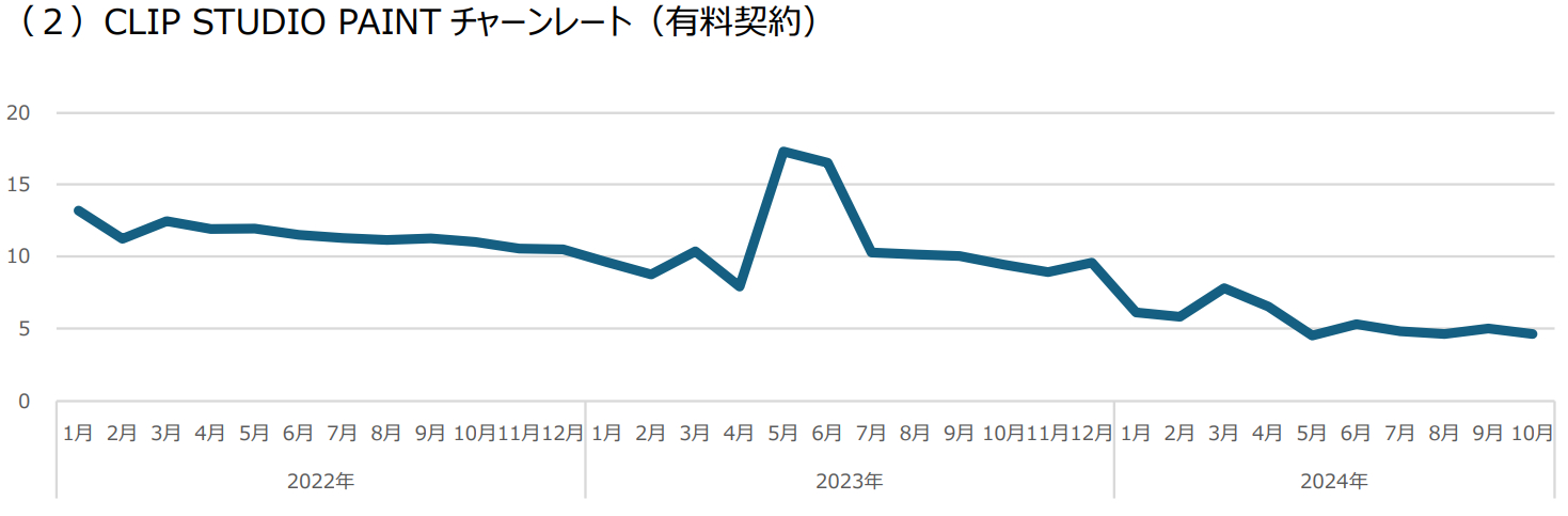 また、CLIP STUDIO PAINT チャーンレート(有料契約の解約率)は4.6%と前年同月の9.4%から低下した。