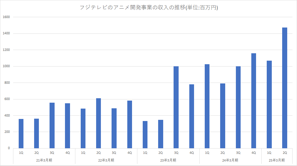 フジ・メディア・ホールディングス<4676>は、この日(11月7日)、第2四半期(24年7~9月)におけるアニメ開発の事業収入が前年同期比85.9%増の14億7200万円と大きく伸びたことを明らかにした。