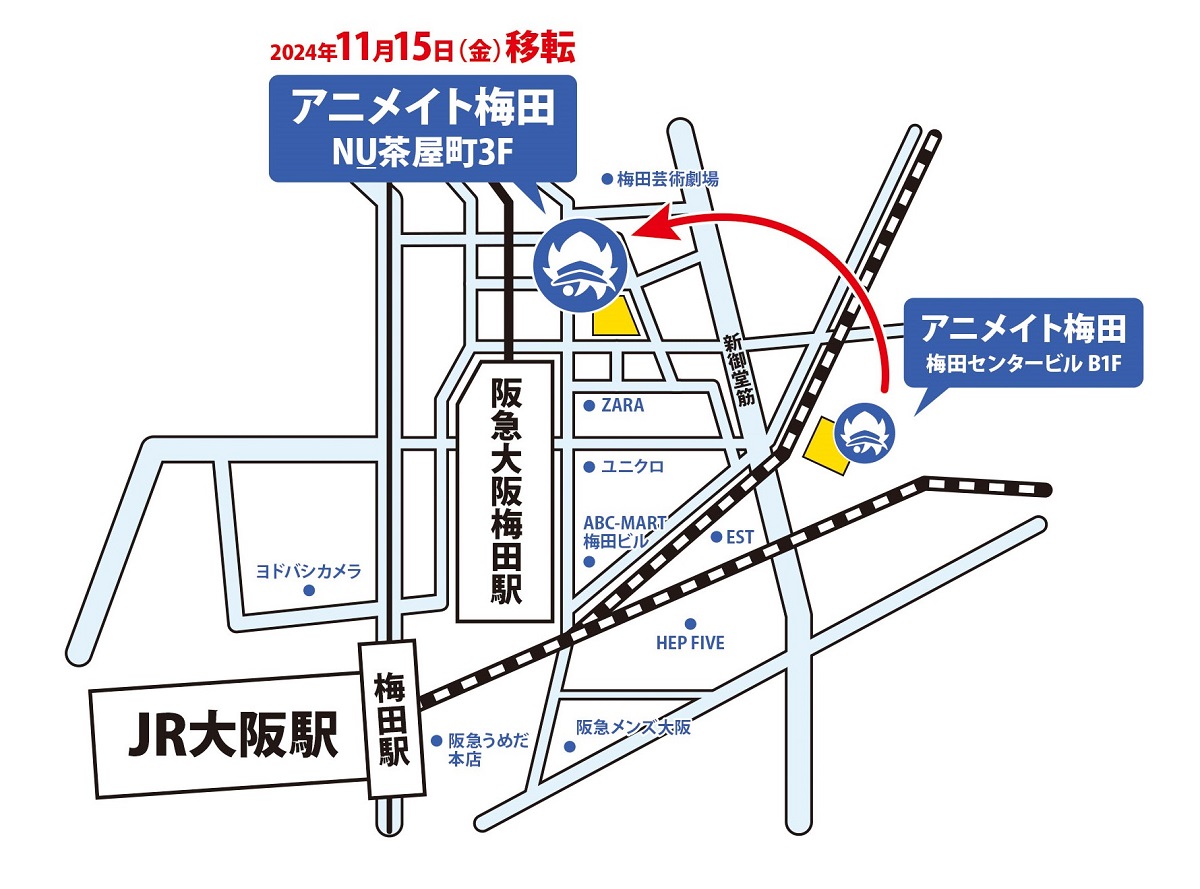 アニメイトは、大阪・梅田にある「アニメイト梅田」を2024年11月15日にNU茶屋町3Fへ移転リニューアルオープンすることを発表した。