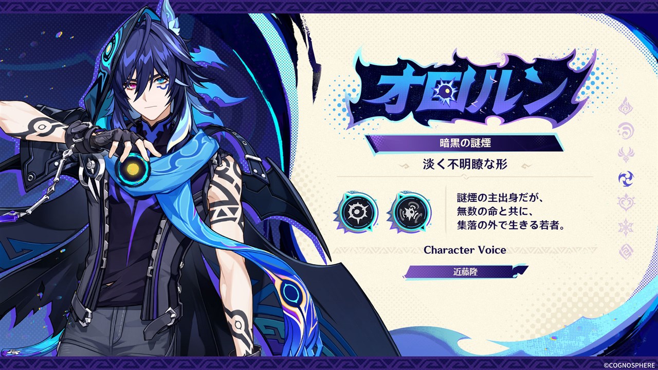 謎煙の主出身だが、無数の命と共に、集落の外で生きる若者。優秀なサポーターである彼は、雷と水元素のキャラクターとチームを組んだ時に、とりわけ強力なサポートを提供してくれる。チーム内のキャラクターが「夜魂バースト」を起こした時、あるいはオロルンの元素スキル発動後、チーム内のキャラクターの水元素または雷元素ダメージを与えた時、オロルンは一定の夜魂値を獲得する。敵が感電ダメージ、または夜魂性質のダメージを受けた場合、オロルンは夜魄の加護状態に入り、雷元素ダメージを与える。また、オロルンは「ウルトラソニック・アイ」を召喚して敵を挑発して引き付けることもできる。戦闘以外でも、オロルンは鋭い視力によってチームに貢献し、狙い撃ちをする時、オロルンは「霊覚」状態に入り、ラクガキや符文から力を抽出できるほか、探索中はチームがより速く飛べるようにサポートしてくれる。