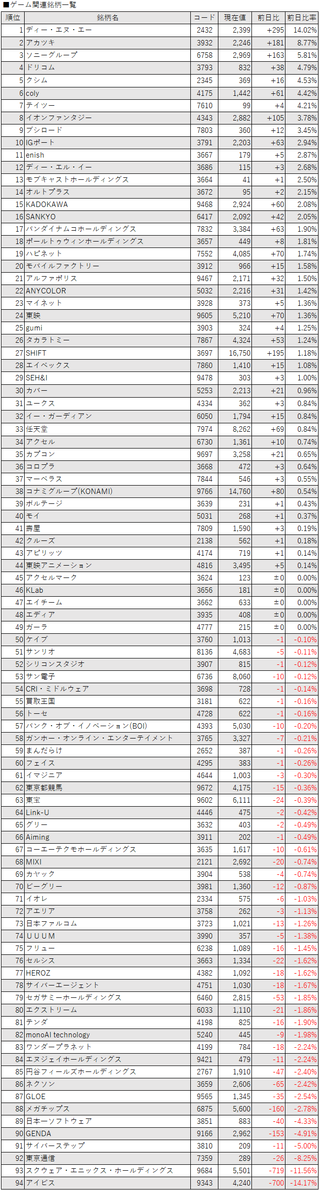 こうしたなか、ゲーム・エンタメ関連企業をみると、登録されている94銘柄のうち、上昇は44銘柄(47%)、下落は45銘柄(48%)、変わらずは5銘柄(5%)で、下落した銘柄の方が多かった。
