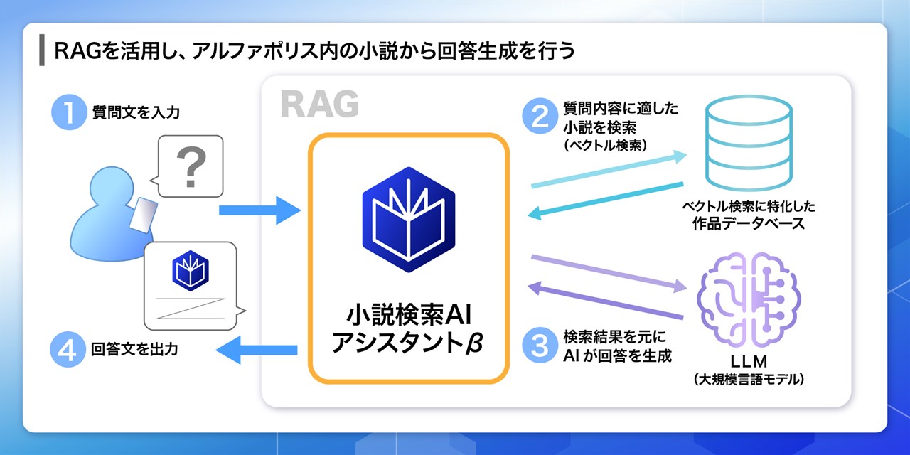 本機能はRAG(検索拡張生成)を活用することで、読者からの質問に対して膨大な小説データの中から最適な作品をベクトル検索により抽出、その検索結果に基づいて大規模言語モデル(LLM)が回答する、という仕組みを採用している。サービス内に実在する小説作品に基づいて回答が生成されるため、ハルシネーションの発生を軽減し、回答の精度を高めることが可能となる。