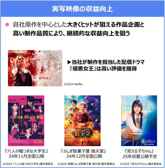 KADOKAWA<9468>は、9月中間決算の説明資料で、実写映像の収益向上に取り組んでいることを明らかにした。自社原作を中心に大きくヒットが狙える作品企画と高い制作品質により継続的な収益向上を狙うという。