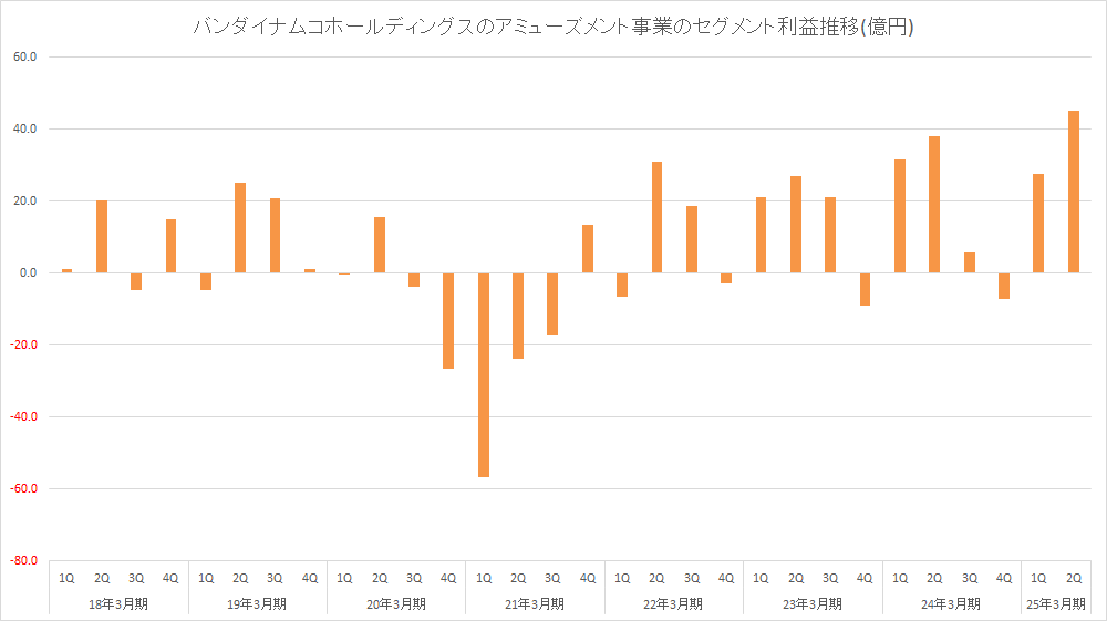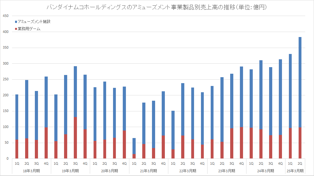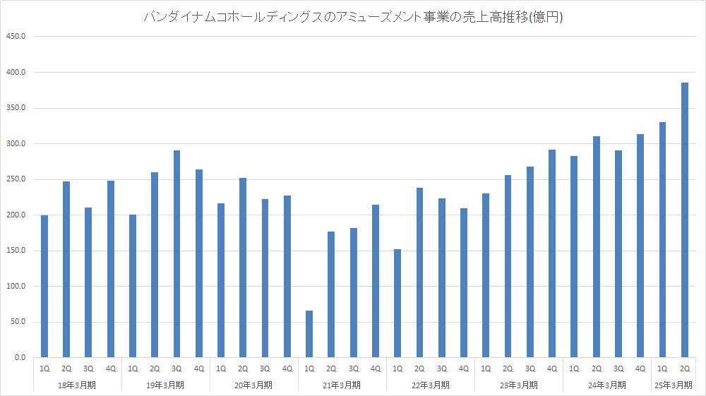 バンダイナムコホールディングス<7832>の第2四半期(24年7~9月)におけるアミューズメント事業の業績について、売上高が前年同期比24.5%増の386億1300万円、営業利益が同18.3%増の45億1800万円と2桁の増収増益となった。売上、利益ともに直近の売上・利益で最高水準となった。アミューズメント施設と業務用ゲームの売上がそれぞれ伸びた。