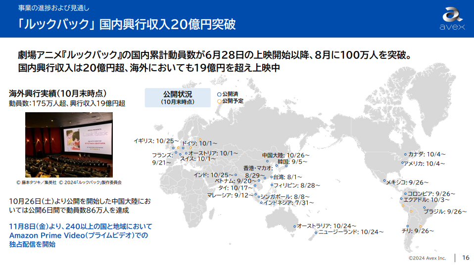 エイベックス、アニメ事業の業績が急回復 第1四半期3億円の赤字から9月中間は黒字転換 劇場アニメ『ルックバック』が国内外で大ヒット