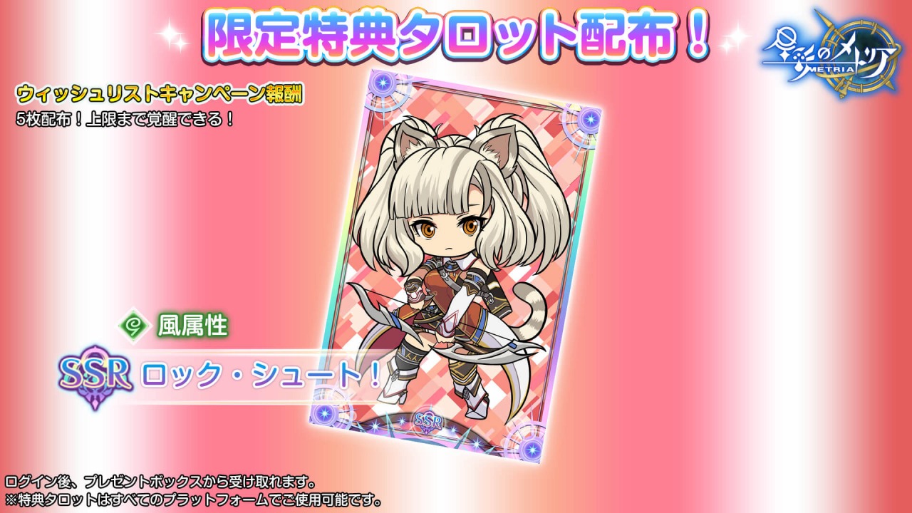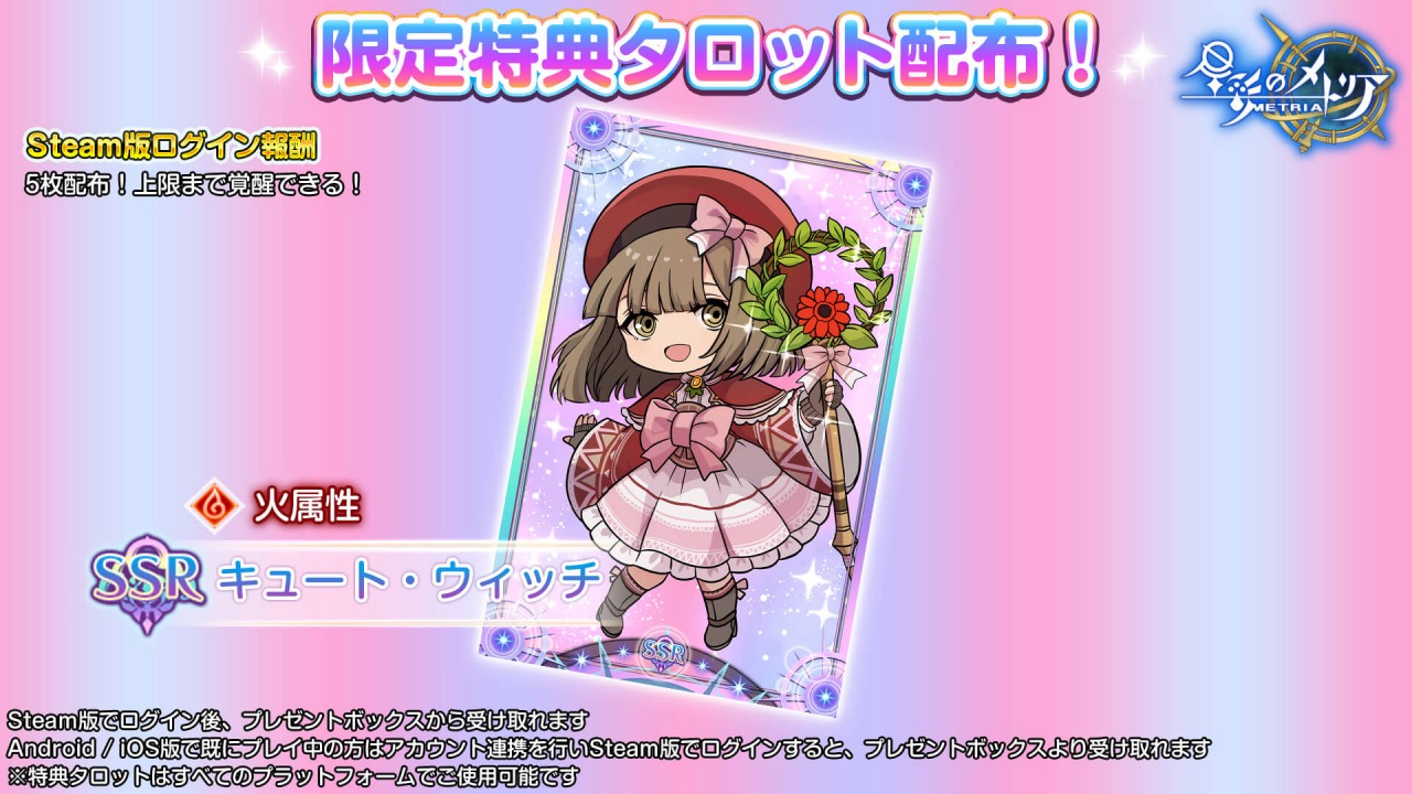 Steam版ではスマートフォン版のストーリーが PC の大画面で楽しめ、より一層広がりのある冒険が体験できる。今回の配信にあわせ、Steam ウィッシュリストキャンペーン限定特典タロット「ロック・シュート!」および「キュート・ウィッチ」をプレゼントする。