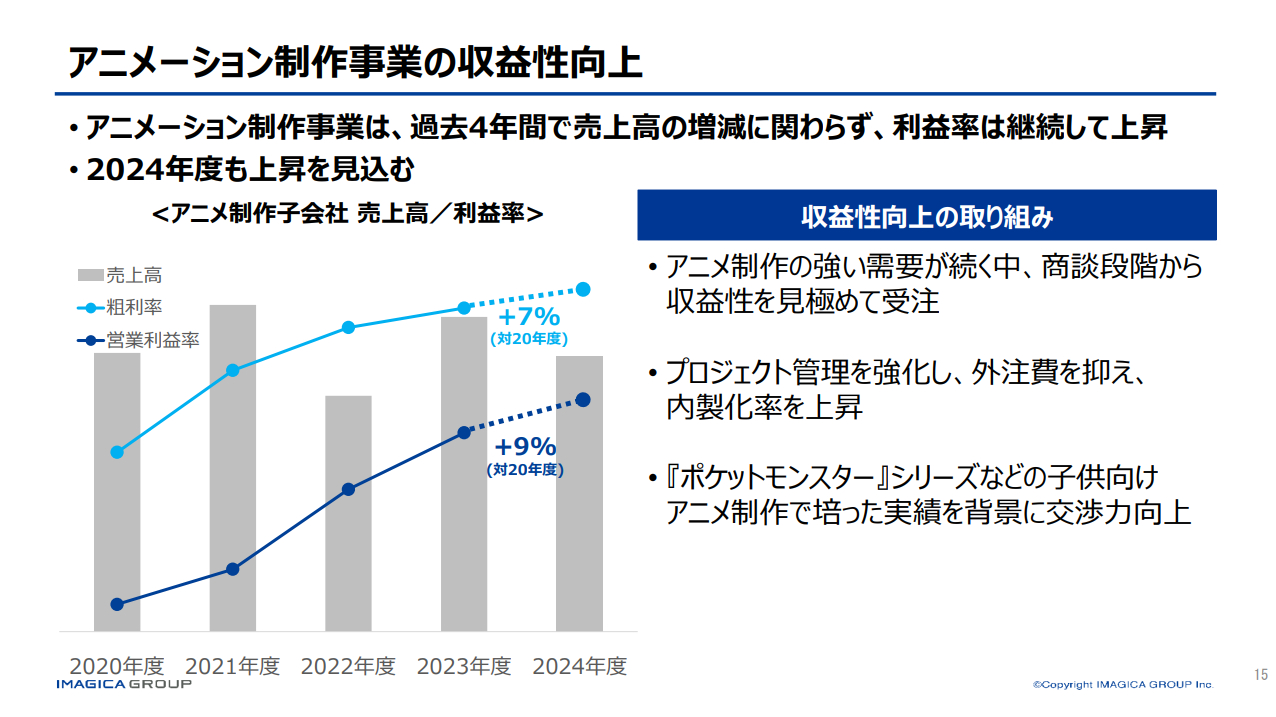 子供向け作品の制作で実績を積んだことで交渉力が向上したほか、プロジェクト管理の強化と内製化率の向上、収益性を見極めたうえでの受注など収益性を高める取り組みを行ったことが奏功した。
