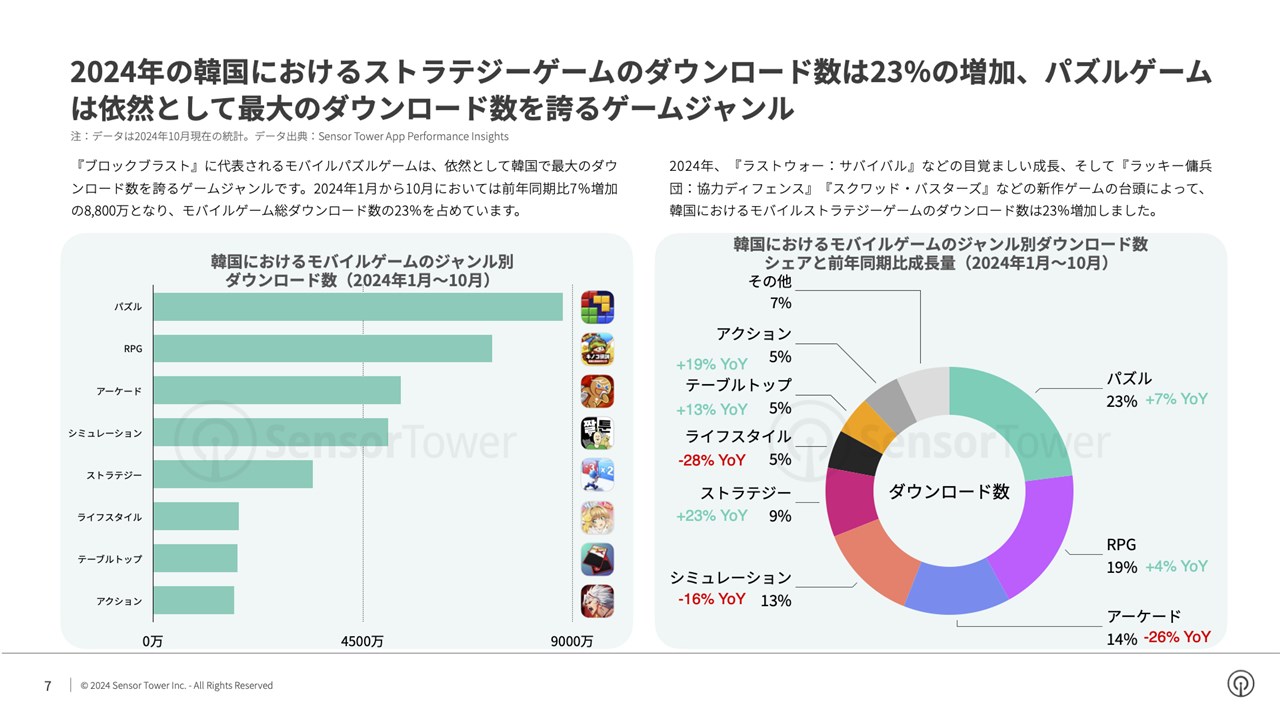 『ブロックブラスト 』に代表されるモバイルパズルゲームは、依然として韓国で最大のダウンロード数を誇るゲームジャンル。2024年1月から10月においては前年同期比7%増加の8,800万となり、モバイルゲーム総ダウンロード数の23%を占めている。