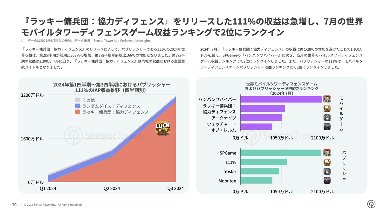 『ラッキー傭兵団:協力ディフェンス』のリリースによって、パブリッシャーである111%の2024年世界収益は、第2四半期が前期比308%の増加、第3四半期が前期比166%の増加となった。第3四半期の収益は3200万ドルに迫った。