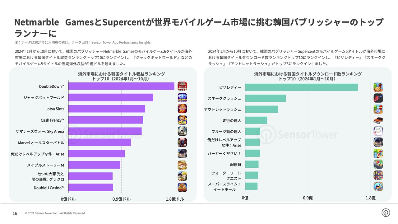 韓国パブリッシャーのNetmarble GamesおよびSupercentは、ゲームの海外進出におけるトップランナーになった。2024年1月から10月において、韓国のパブリッシャーNetmarble Gamesのモバイルゲーム6タイトルが海外市場における韓国タイトル収益ランキングトップ10にランクインし、『ジャックポットワールド』などのモバイルゲーム5タイトルの当期海外収益が1億ドルを超えた。