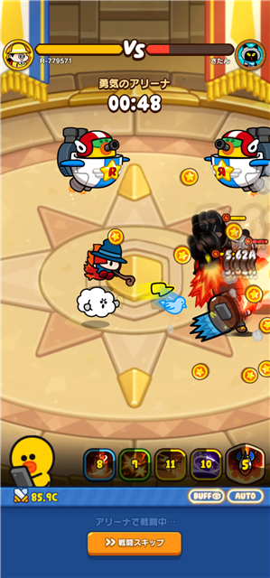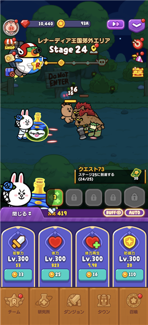 今回の先行体験会では、ゲームの序盤をプレイできたほか、特別に成長済みのデータも体験することができた。最初はひとりのリーダーレンジャーが敵を迎え撃つという多くの方がイメージする放置系RPGの画面だが、出撃するキャラが増え、スキルも飛び交う戦闘が繰り広げられるのでかなり爽快!