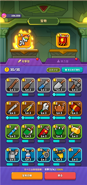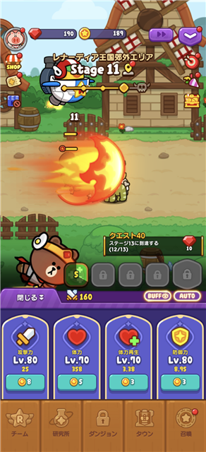 ▲放置系RPGなので、基本は放置しているだけでもどんどん敵を倒して進んでいく。道中で手に入るグランを使えば、攻撃力、体力、体力再生、防御力などのステータスを上げることができる。