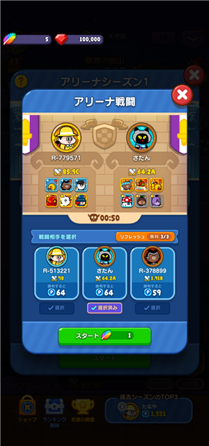 ▲アリーナでは他プレイヤーのパーティとのバトルが勃発。戦闘に入る前には複数の相手からステータスを見て選択できる。