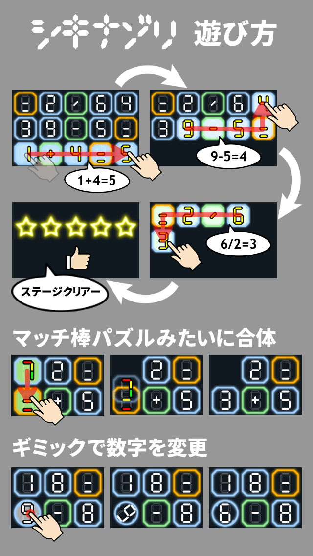 このアプリは数字をなぞって数式をつくるシンプルなパズルゲーム。足し算、引き算、掛け算、割り算が分かれば誰でも遊べる。
