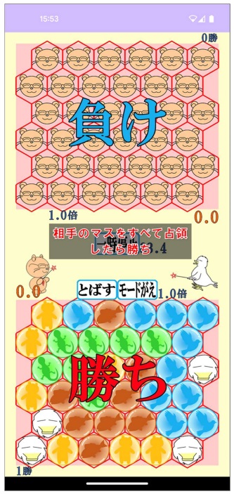 人間どうしの対戦でもコンピューターとの対戦でも、対戦条件をいろいろ指定できる。自分と相手それぞれについて、『マスの数』『色の数』『攻撃倍率』などを指定することができる。対戦条件を変えるとゲーム性がちょっと変わってくることもあり、いろいろな遊び方ができるだろう。