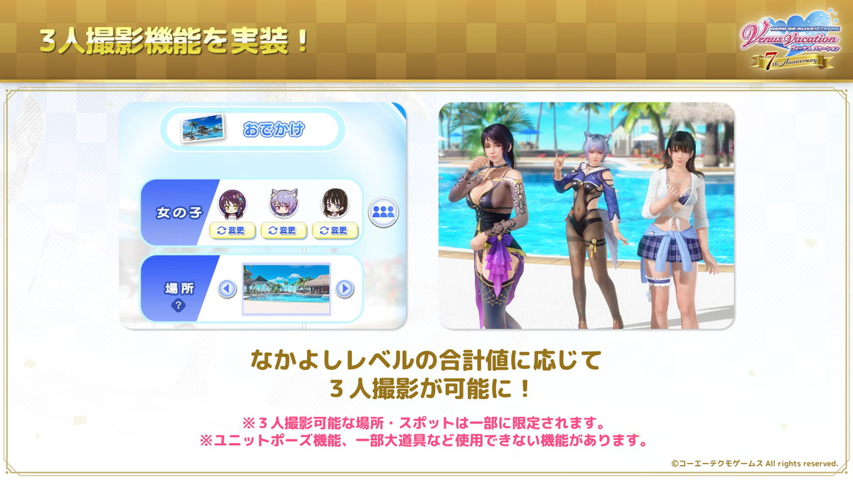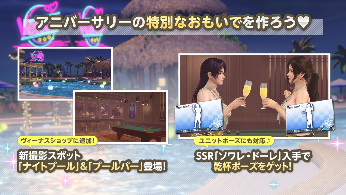 さらに、7周年にあわせて、ヴィーナス諸島に「バー」がオープンするほか、女の子 3 人での撮影機能の追加、新撮影スポット「ナイトプール」「プールバー」の追加など、女の子とのふれあいがさらに楽しくなるようなアップデートを行っている。