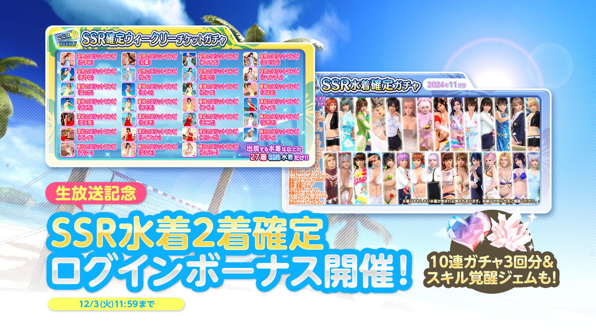 「7th アニバーサリーキャンペーン」では、公式生放送報酬として、「SSR 確定ガチャチケット(2024 年 11 月号)」「SSR 確定ウィークリーガチャチケット」などを受け取れる期間限定ログインボーナスを開催する。
