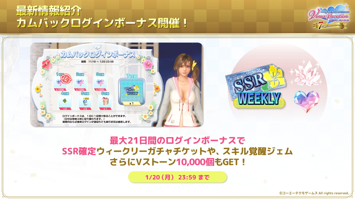 そのほかにも、『DOAXVV』を久しぶりに遊ぶ人を対象に豪華アイテムが獲得できる「カムバックログインボーナス」を開催している。