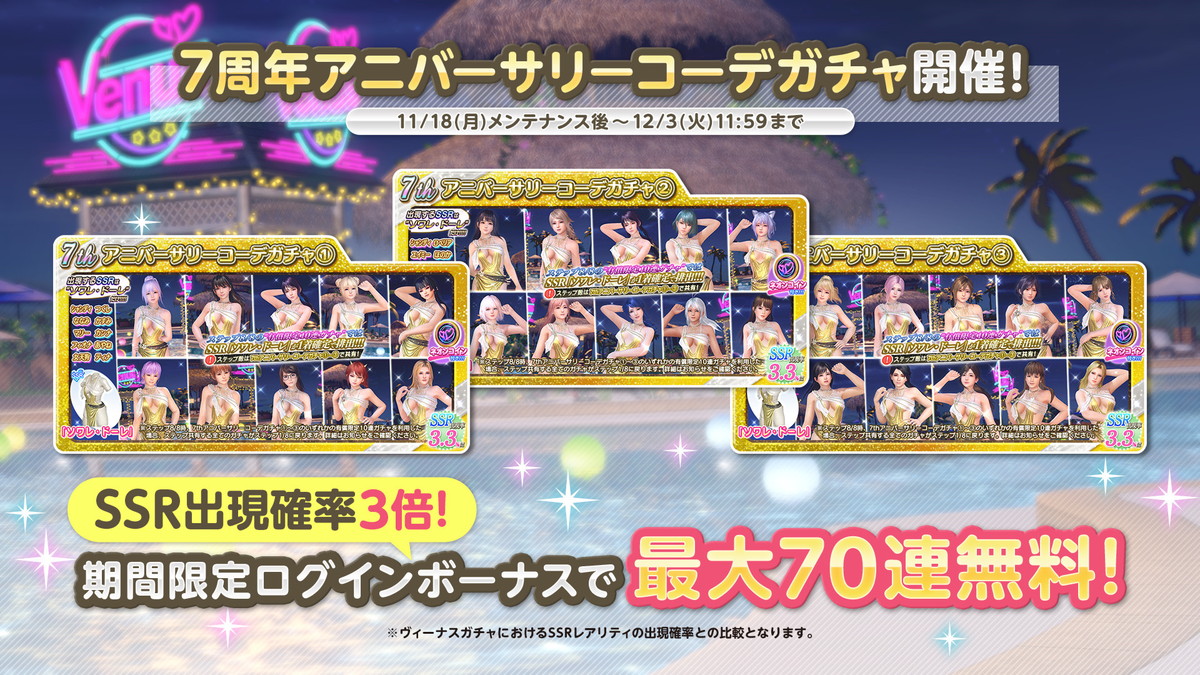 「7th アニバーサリーコーデガチャ」では、パーティードレスをイメージした新 SSR 水着「ソワレ・ドーレ」が登場。きらびやかでゴージャスなドレスアップを楽しむことができる、特別な仕様の水着。最大 100 連無料でガチャを回すことができるうえ、通常のヴィーナスガチャと比較して SSR 出現確率が約 3 倍になっているので、ぜひ「ソワレ・ドーレ」を入手し、ヴィーナスたちと一緒に7周年をお祝いしたい。