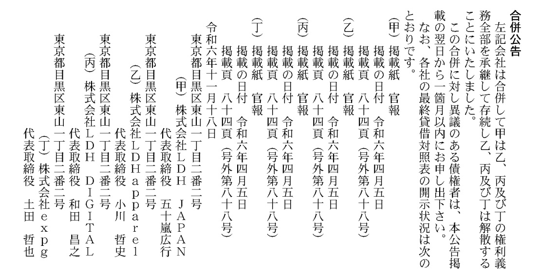 LDH JAPANは、グループ会社である「株式会社expg」と「株式会社LDH apparel」「株式会社LDH DIGITAL」の3社を吸収合併する。11月18日付の「官報」に掲載された「合併公告」によると、LDH JAPANが3社の権利義務を引き継ぎ、3社は解散するとのこと。