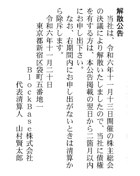 BlockBase株式会社が解散したことがわかった。11月20日付の「官報」に掲載された「解散公告」によると、11月13日開催の株主総会で決議したとのこと。
