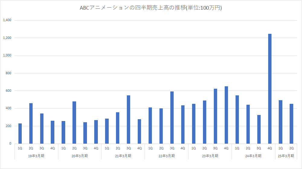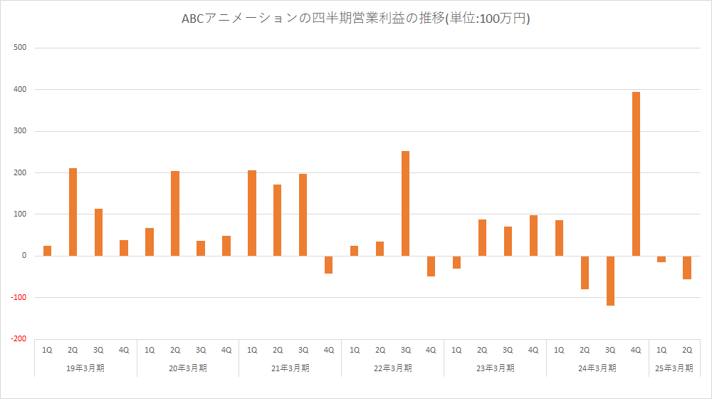 アニメ業界 ABCアニメーション、第2四半期決算は売上高2.3%増の4億5200万円、営業損失5500万円と増収・赤字幅縮小 朝日放送グループホールディングス ABCアニメーション 朝日放送GHD、ABCGHD ABCアニメーション 24年7-9月決算 2024.11.21 14:38 ABCアニメーションの第2四半期(7~9月)決算は、売上高4億5200万円(前年同期比2.3%増)、営業損失5500万円(前年同期は8000万円の損失計上)と増収・赤字幅縮小だった。 同社は、朝日放送グループホールディングス<9405>傘下のアニメーション製作会社。 業績推移は以下の通り。