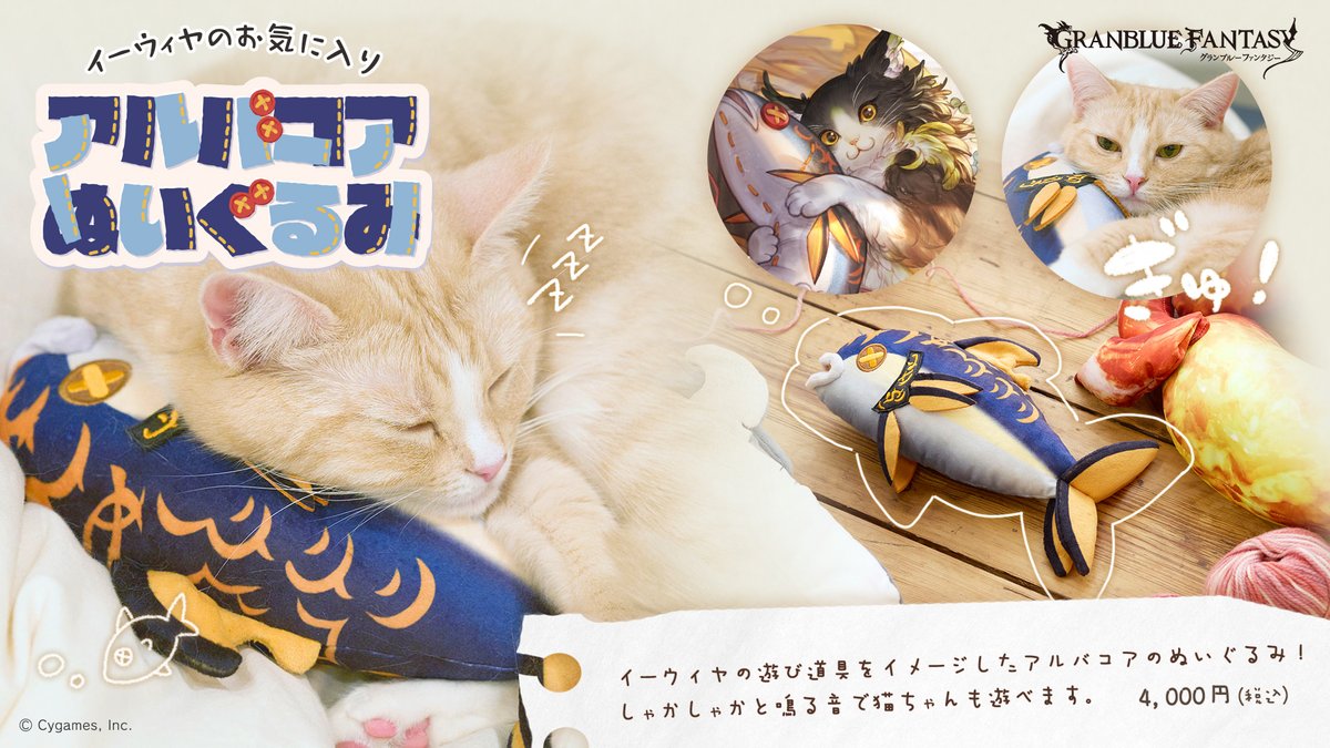 多数の猫がキャラクターとして登場している『グラブル』。過去の『グラブルフェス』では、上記のイーウィヤお気に入りのぬいぐるみを模した、猫用けりぐるみなども販売していた。