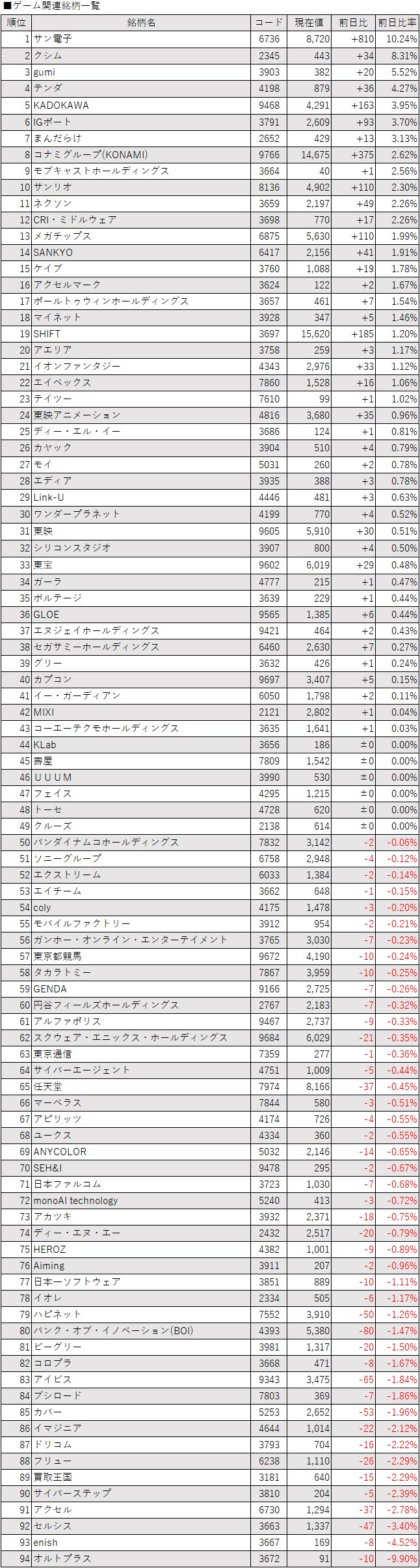 そうした中でゲーム・エンタメ関連株の動きを見てみると、下記の表に登録しているゲーム・エンタメ関連企業94銘柄のうち、上昇は43銘柄(46%)、下落は45銘柄(48%)、変わらずは6銘柄(6%)で、下落した銘柄の方がわずかに多かった。